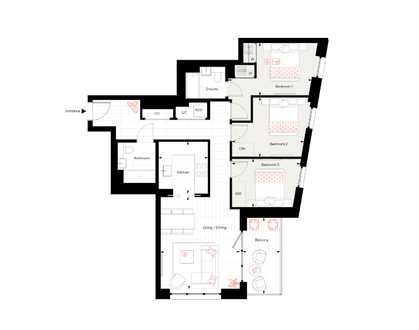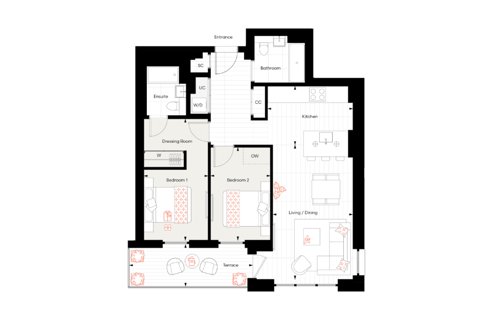 This modern two bedroom apartment offers spacious living with its functional interior plan, open-plan lounge-kitchen layout and large private terrace, one of which has an en-suite bathroom. With its separate dressing area, smart storage solutions and bright living spaces, it is an ideal option for both residence and investment.